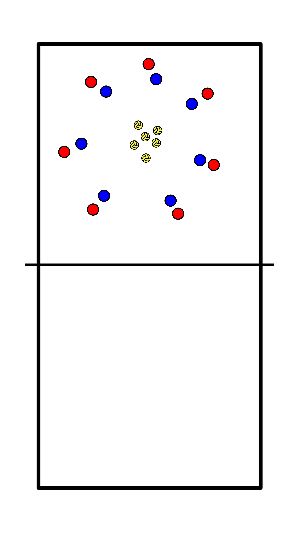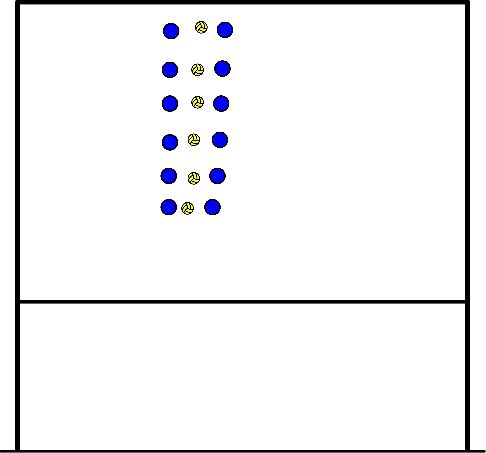 - 1 player on the court, the rest stand behind the end line in the waiting area.