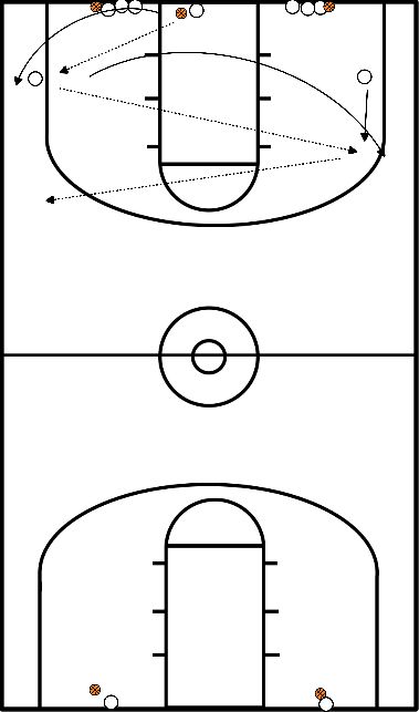 - 2 jugadores empiezan en la línea de 3 puntos + 1 jugador con el balón encima
