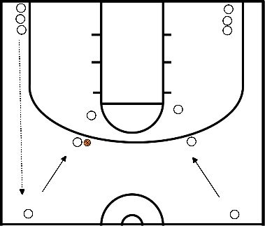 - El jugador defensivo que coge rebote o roba se va al otro lado de la cancha con los 2 jugadores que estaban en línea de fondo