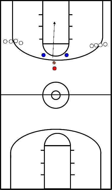 - Jugador en la línea de fondo pasa con fuerza al jugador situado alrededor de la línea de 3 puntos