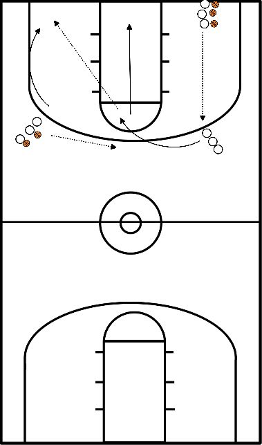- 1 jugador empieza en el centro y elige un lado hacia el que correr, luego recibe el balón del jugador de la línea de fondo y lanza a canasta