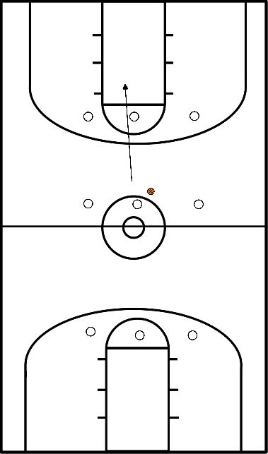 - Blanco recibe el pase de azul en la línea de tiros libres y se dirige hacia la canasta