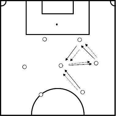 Cuando el jugador de la derecha recibe el balón, el jugador de la derecha en línea juega el balón al jugador entrante de la izquierda en línea.