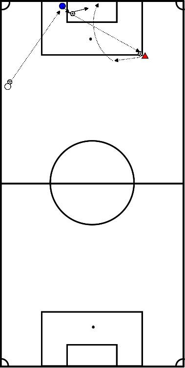 - El entrenador juega de espaldas, el jugador 3 coge el balón, realiza la acción y remata a puerta.