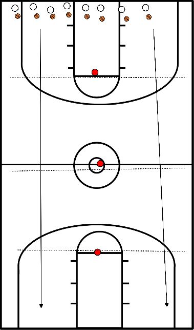 - De l'autre côté du terrain, un lay-up est effectué et les joueurs retournent de l'autre côté du terrain.