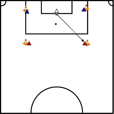 - Le joueur rouge (sur la ligne de fond) joue le ballon en diagonale vers le joueur bleu qui se trouve en face de lui.