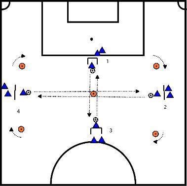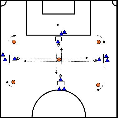 - L'attaquant va chercher le ballon et essaie de marquer en 1V1 dans le but juste devant lui.