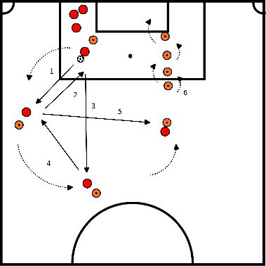 - S2 tourne vers l'extérieur et fait une double passe à S3 qui demande le ballon avec une action préalable.
