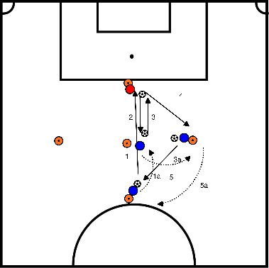 - Le joueur rouge (sur la ligne de fond) joue le ballon en diagonale vers le joueur bleu qui se trouve en face de lui.