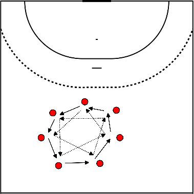 - 1 défenseur entre la ligne médiane et la ligne des 9 mètres tente d'intercepter.