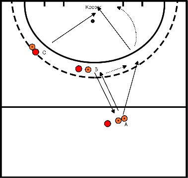 - C reçoit le ballon et accélère au-dessus de la ligne arrière pour faire une passe à 90 degrés à A qui a couru vers le cercle avant.