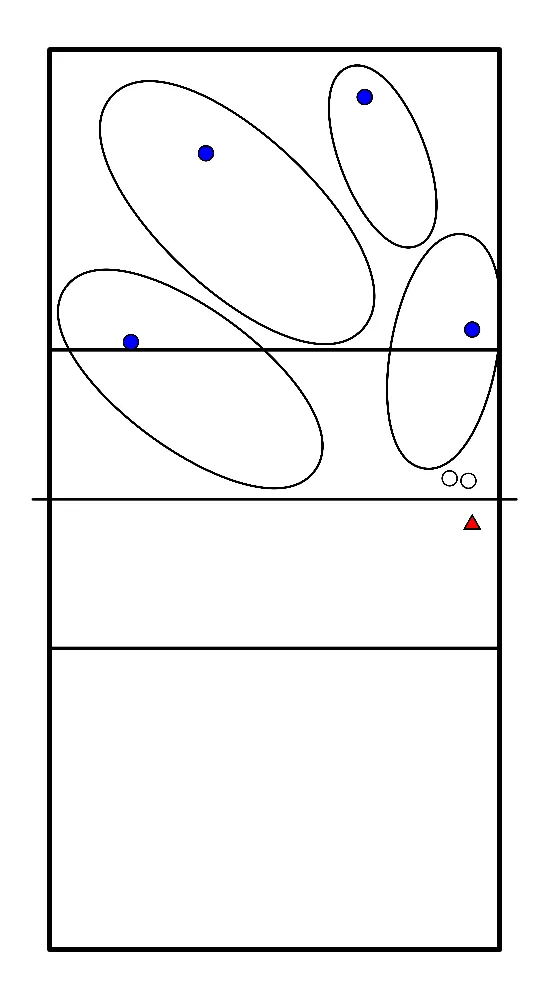 - Simulez une balle vers le contreur central, nécessitant l'aide des joueurs de l'extérieur et de l'opposé pour le blocage, puis déplacez-vous sur les côtés avec un blocage en déplacement pour protéger une frappe en ligne.