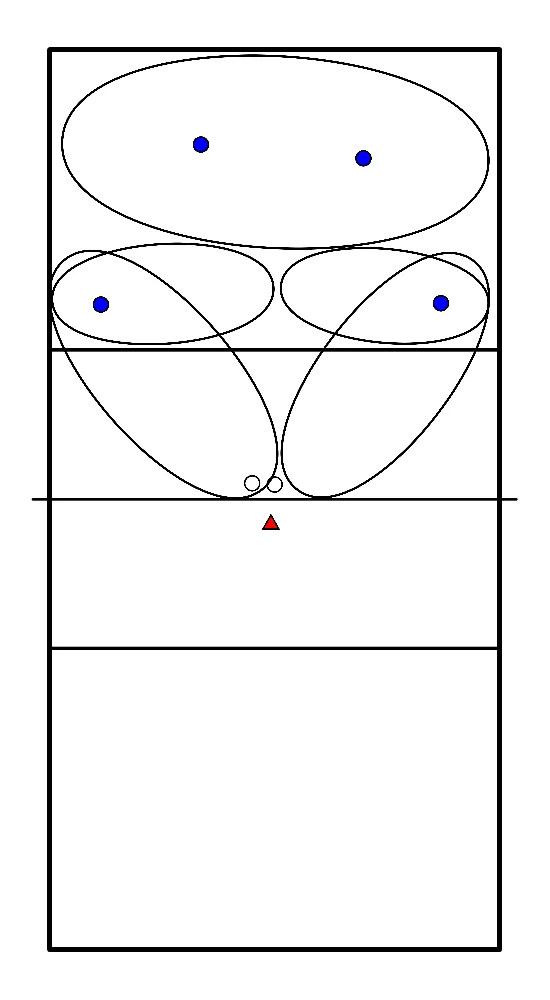 - Lorsque le joueur sur la boîte du milieu frappe vers la zone 1, les contreurs centraux positionnent leurs bras pour fermer la zone 1 et effectuent un blocage en déplacement vers la gauche.