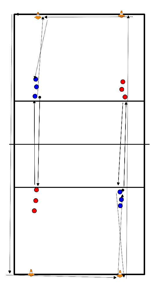 - L'entraîneur lance le ballon, le passeur respectif se lève et joue le ballon au passeur.