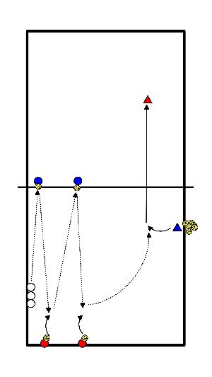 - Le joueur du milieu rejoue le ballon et ce ballon est attaqué sur le 3ème joueur.