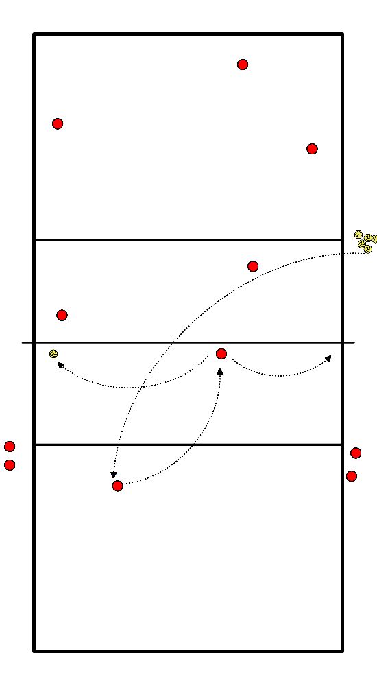 - Idem, mais 3 de l'autre côté défendent la balle, et jouent pendant l'échange.