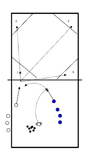 - Le joueur en position 3 lance un ballon court à l'intérieur des trois mètres.
