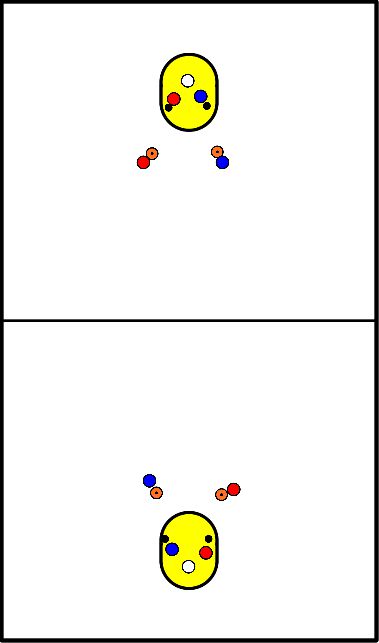 Due canestri uno di fronte all'altro. In ogni canestro una palla e due giocatori.