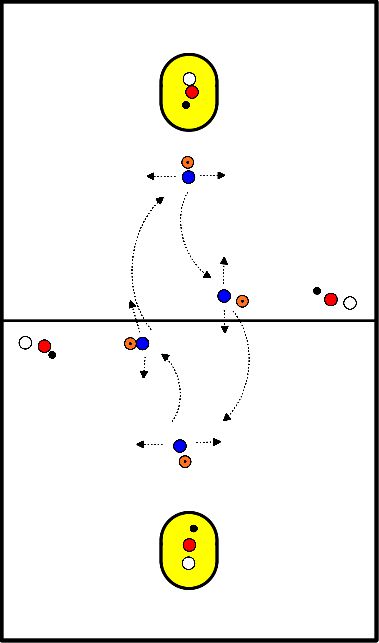L'obiettivo di queste esercitazioni è far sì che le coppie di tre/quattro persone si muovano a ritmo costante e si alternino nell'opportunità di segnare.