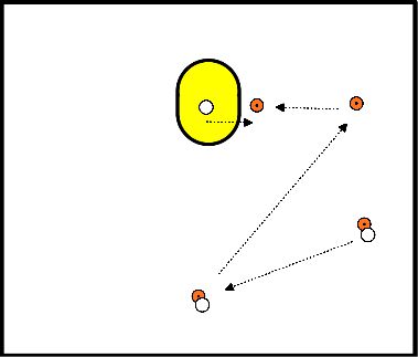 • Il numero 2 corre verso il pione 1 e indietro, verso il pione 2 e indietro, verso il pione 3 e prende una palla passante, prende la palla e si posiziona in una rimessa in gioco.