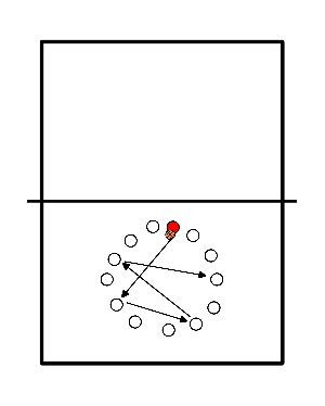 - I giocatori iniziano sotto il cerchio (2 gruppi di 5-6 giocatori, due per gruppo hanno la palla) ==> esercizio veloce ed esplosivo.