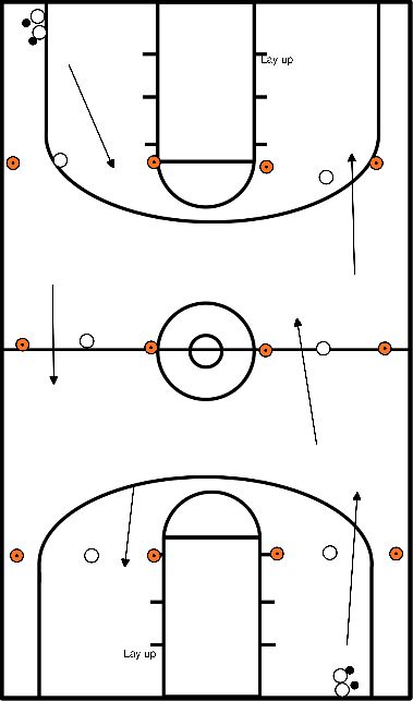 - Il giocatore senza palla corre intorno al pilone, riceve il passaggio dal giocatore davanti dell'altra fila ed esegue un lay-up/tiro.