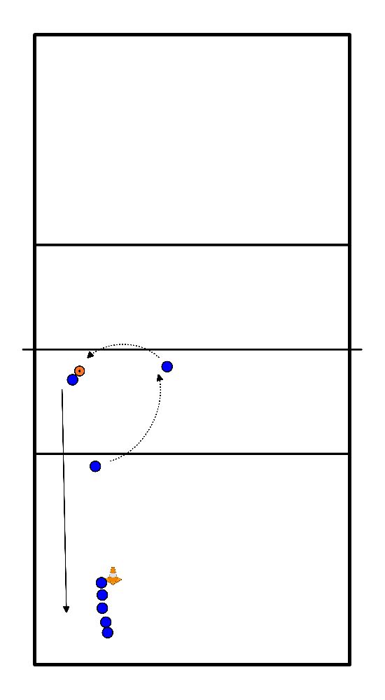 - Il giocatore si alza rapidamente e passa la palla al palleggiatore (SV) nella posizione centrale anteriore.