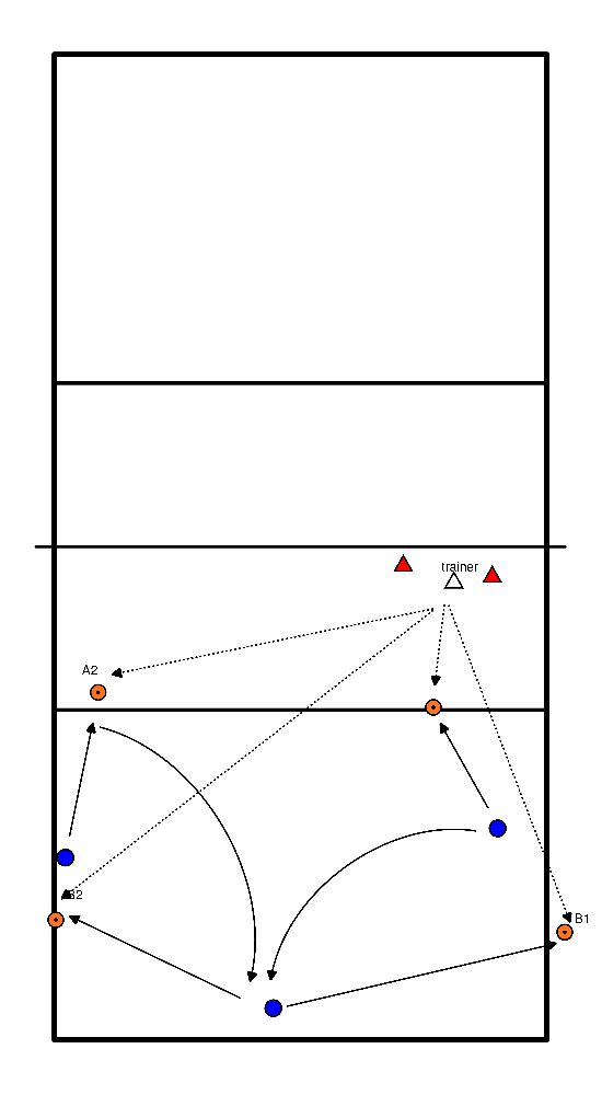 13. B lancia la palla ad A, corre verso i 3 metri e riceve la palla di punta, gioca alta verso A, A può ora scegliere, nuova palla di punta o TT e attacco all'indietro.