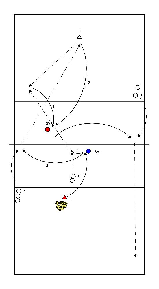 - Nel frattempo, Sv corre alla destra del giocatore 1 per ricevere il passaggio.