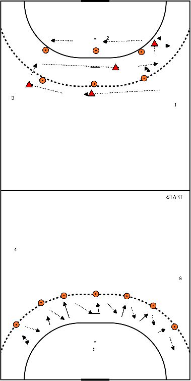 - Speler gooit bal naar trainer, loopt in, vangt de bal bij de 9 meter en maakt af met 3 passen- sprongschot