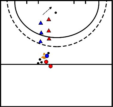 - Speler blauw start met de bal bij de oranje pion.