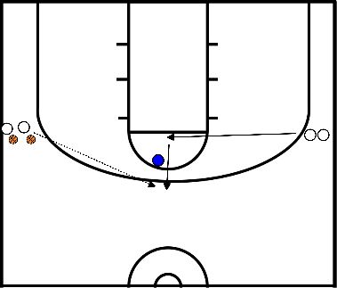 - Wit past de bal naar blauw en maakt direct een snijdende beweging naar de basket.