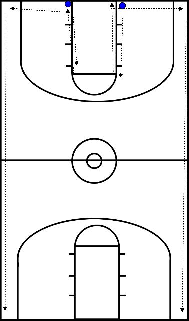 - Speler 1 dribbelt in 2 dribbels tot aan de driepuntlijn