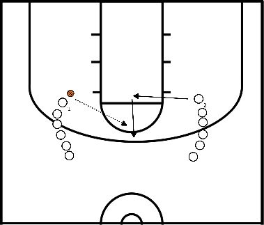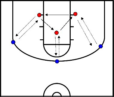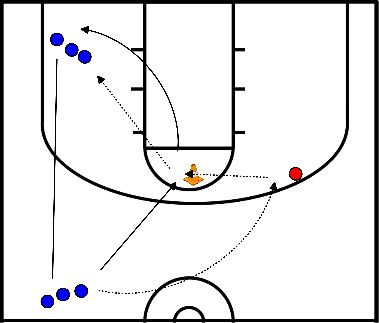 - Wit past de bal naar blauw en maakt direct een snijdende beweging naar de basket.