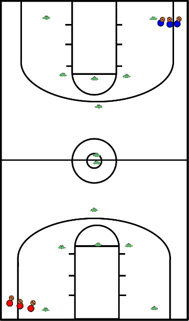 - Dit patroon wordt herhaald terwijl de spelers richting de basket aan de andere kant van het veld bewegen.