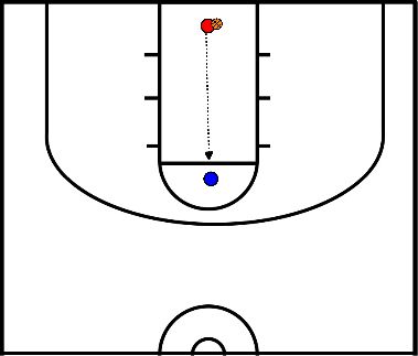 - De eerste speler in rij met 2 ballen (blauw) begint: hij schiet (jump-shot) en volgt zijn eigen rebound.