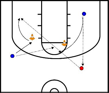 - De outlet-speler (2) passt naar de speler in de middencirkel (3), die vervolgens dribbelt tot ongeveer de driepuntslijn en een stuiterpass geeft aan (1) voor een lay-up.