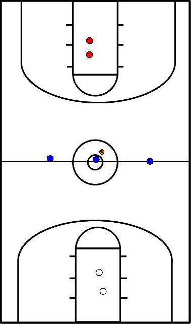 - Op signaal van de trainer loopt de partij die op dat moment de bal pakt een break op de andere basket