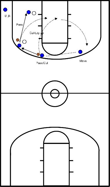 • Speler zonder bal maakt in/out v-cut en komt omhoog naar vrijeworplijn (vragen om de bal)