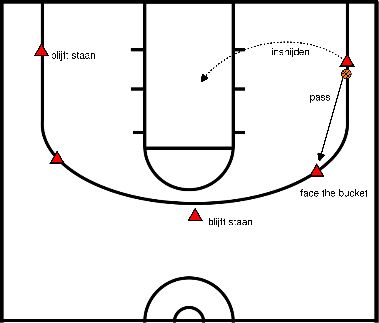 - Wanneer de speler in de tweepuntruimte komt, ontvangt hij de bal van de speler op de baseline.
