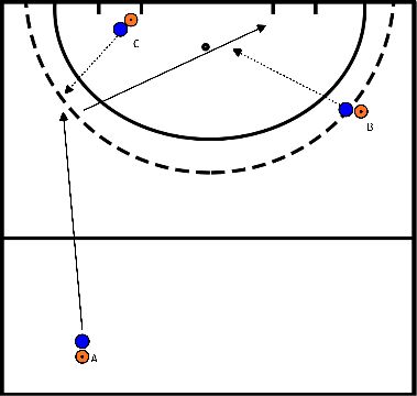 - Drie aanvallers dringen de cirkel binnen met als doel te scoren.