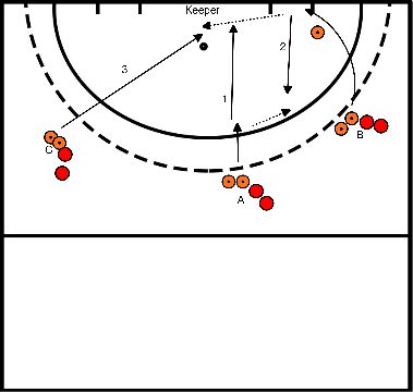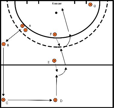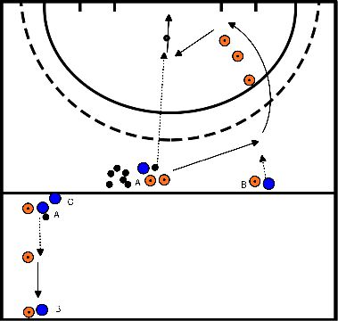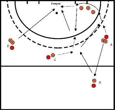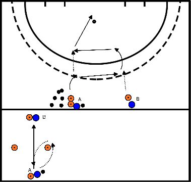 - Speler blauw A start met lopen richting de rand van de cirkel en ontvangt de bal van speler blauw ->
