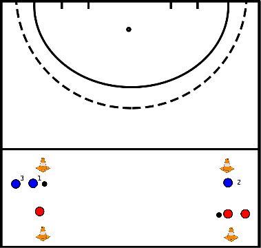 - Speler blauw A start met lopen richting de rand van de cirkel en ontvangt de bal van speler blauw ->