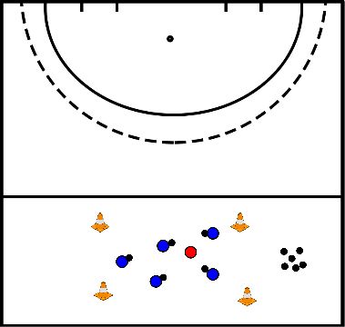 - Drijf een rondje om de groene pionnen en leg de bal met de hand op pion rood.