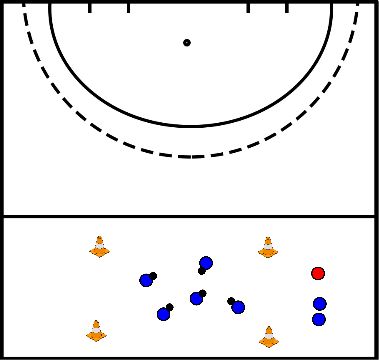 - Drijf daarna met bal een rondje om de groene pionnen en geef de bal door aan de volgende.