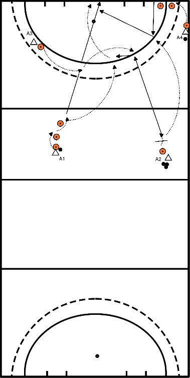 • Speler 3 tracht naar kop cirkel te lopen maar haalt de bal terug bij de ion en passt naar speler 4.