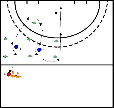 • C loopt langs de pionnenlijn en past de bal naar A die door is gelopen naar de cirkel