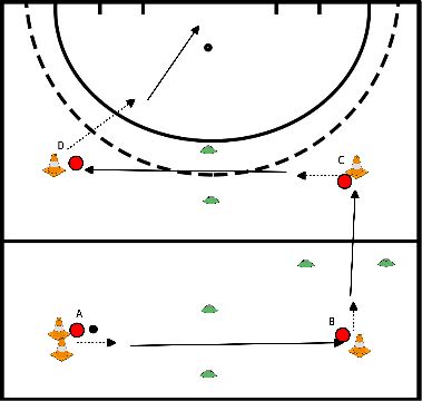 • B neemt de bal in de loop aan en versnelt met de bal aan de stick naar de rand van de 'stippelcirkel'.