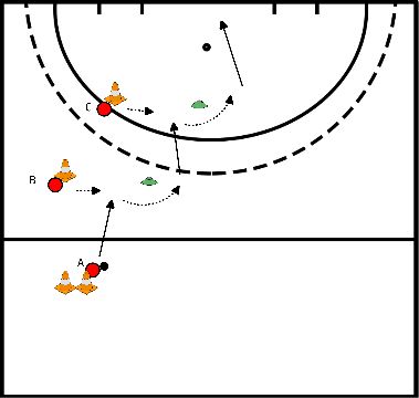 • C drijft om de pionnen de cirkel in en passt naar B die de cirkel in gelopen is