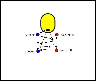- Bal wordt vanuit de voorzijde van de paal gegooid naar de wegtrekkende speler, daarna schot.